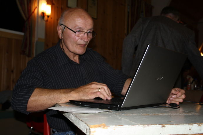 Eystein Bæverfjord fer rundt med PCen sin og viser filmen om "Finnguten" på Nordmøre. Foto: Norunn Holten