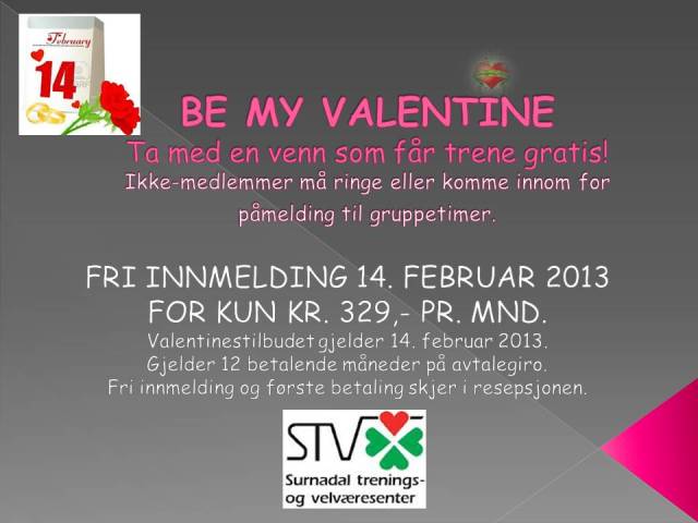 Surnadal trenings- og velværesenter melder om at de i forbindelse med valentinesdagen den 14 februar har følgende tilbud til sine medlemmer: de kan ta med en venn som kan trene gratis på valentinesdagen. Vennen får også mulighet til fri innmelding på Surnadal trenings- og velværesenteret denne dagen.