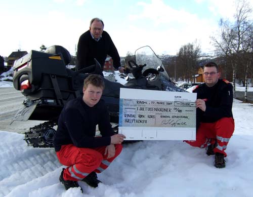 Når Rindal Sparebank har sett over årsregnskapet sitt, vanker det hvert år som regel pene pengesummer på et utall lag og foreninger i bygda. En av årets gavemottakere var Rindal Røde Kors Hjelpekorps, som fikk 20 000 kroner. De var ikke seine om å bruke opp pengene: Tok med seg sin eldste snøskuter og byttet den inn i en ny. I dag kom de rett fra Landbrukssenteret med nyskuteren for å takke banken for gaven: