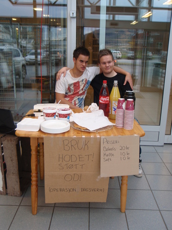 – OD-kampanjen er en veldig fin ting, og mange forbipasserende gir også penger uten å kjøpe noe. Det er veldig trivelig, sier Olav og Helge, som begge går sitt tredje og siste år med studiespesialisering. De to skryter også av Coop, som sponset papptallerkenene og pappkoppene.